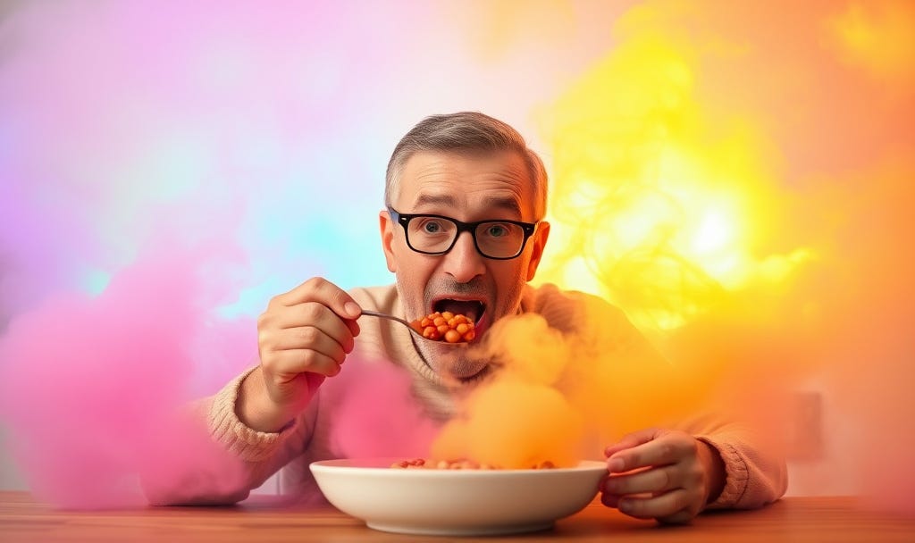 “See, when your dad goes to the buffet line your uncle always follows him. Your uncle always takes too much and leaves nothing for anyone else. We think this has a high likelihood of actually producing more rainbow hues than the previous occurrence thanks to the increased volume of beans in his gullet. ” - Ren Bo Hughes