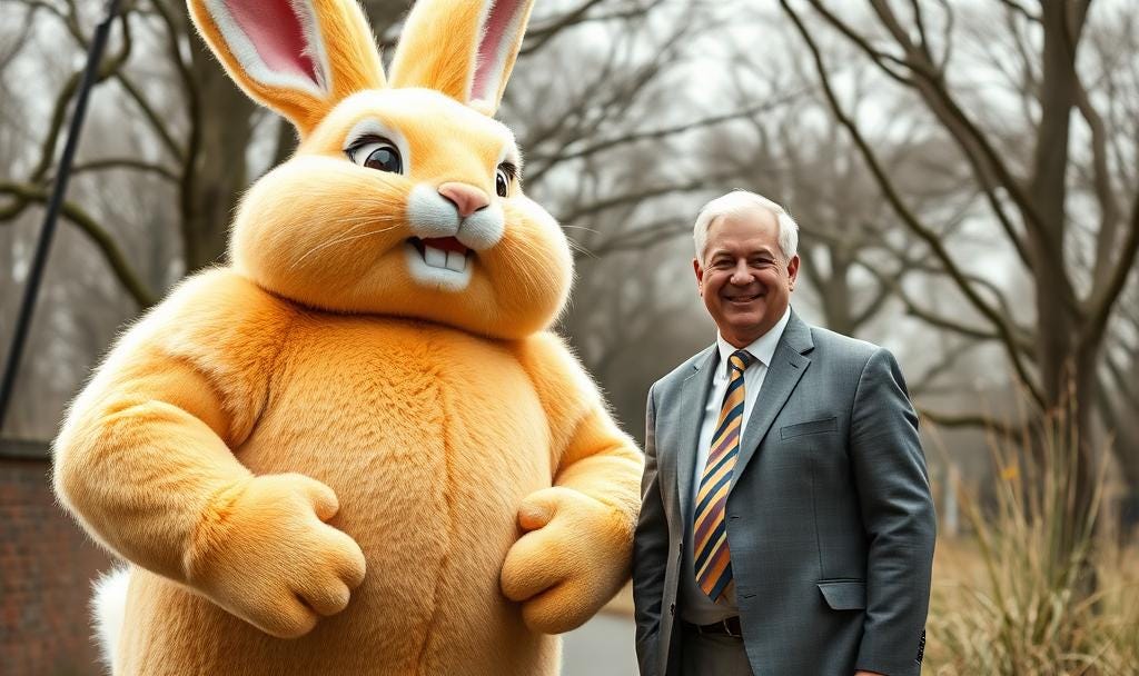 “Oi think we outdid ourselves this time. Gone is the wimpy lil Easter Bunny. We ‘ave now created the Super Easter Bunny™!!! Using technology similar to Captain America we edited the genome of the wimpy original and have created a rabbit capable of producing 5x the eggs at twice the size. Also all you ‘ave to feed ‘im is plastic and cardboard and the eggs still taste good!
