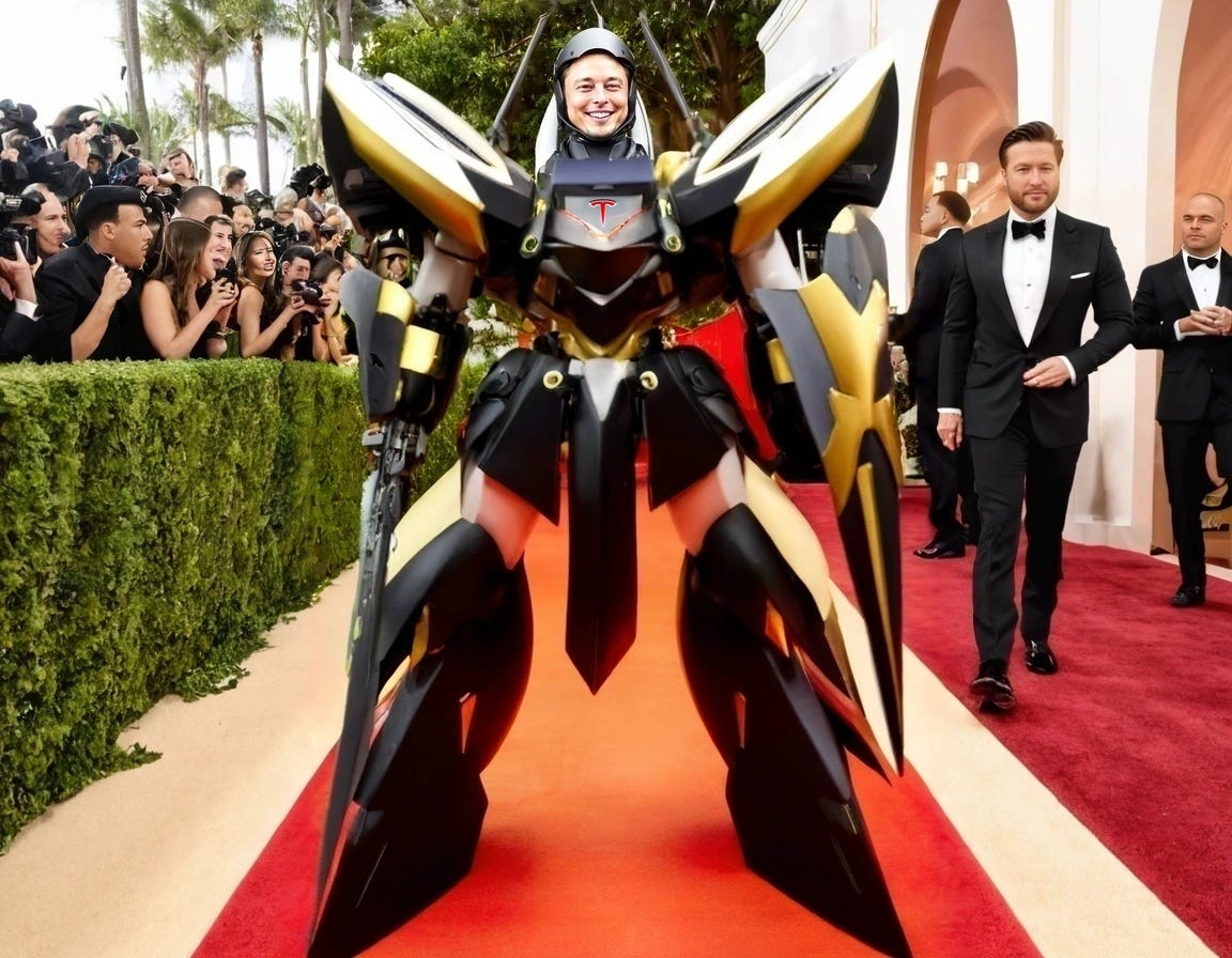 Elon Musk showed up in a new, luxurious, never-before-seen Tesla Robo Warrior Mech Suit estimated to cost $100 million. It comes with options like cuff links, espresso maker and a 100 megaton payload that can delete your enemies in less than 0.5 seconds.